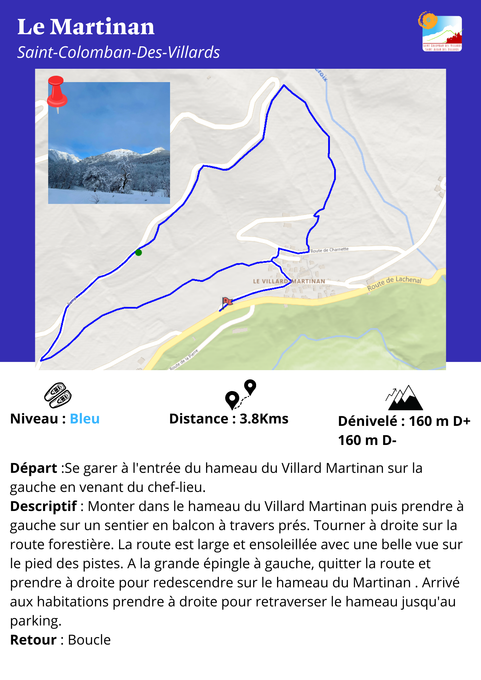 Description: Go up into the hamlet of Villard Martinan, then turn left on a balcony path through meadows. Turn right onto the forest road. The road is wide and sunny, with a fine view of the foot of the slopes. At the large left-hand hairpin, leave the road and turn right to descend to the hamlet of Martinan. When you reach the houses, turn right to retrace your steps through the hamlet to the parking lot.
